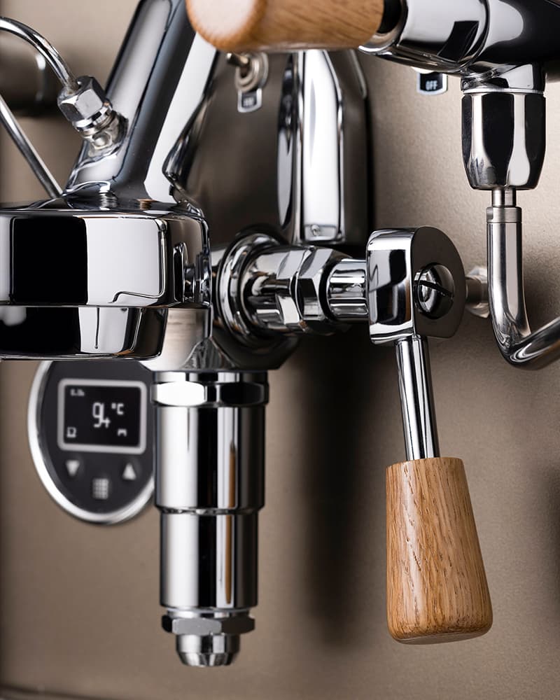 The VESTIGE stands out with its beautifully crafted wooden side panels, wooden feet, and wooden group handles. These carefully chosen elements elevate its image, offering a warm, natural contrast to its sleek metal body, making it a true statement piece in any home, studio or coffee shop.
